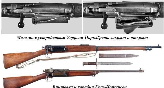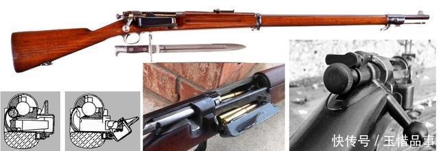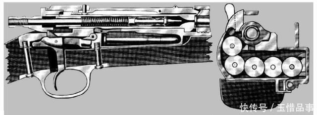在19世纪下半叶的美国, 温彻斯特(Winchester)公司 的卡宾枪和步枪极为流行,它们最突出的特点是 容量很大的弹仓 。这种弹仓是一根位于枪管下方的长管状结构,子弹沿着整根管子纵向排列。 装满弹仓的温彻斯特卡宾枪可以达到 15秒15发 的射速,但把打空的弹仓重新装满却要花相当长的时间——因为子弹必须一发一发地装进去。 此外,子弹沿枪管下方排列,使武器的重量分布随着射击不断变化,影响射击时的平衡性,从而降低射击精度与弹着密集度。 在这方面, 中置弹仓 明显更优:它适合用弹夹或弹包快速装填,而且几乎不会改变武器的平衡。 但这种弹仓的容量要小得多,而且在弹仓没有完全打空之前,通常无法重新装填。 而在实战中,往往需要在短暂的射击间隙里,把一个只打掉一部分的弹仓重新补满;在这种情况下, 一发一发装填的方式反而显得非常方便实用 。 克拉格–约根森步枪 着手把这些彼此差异巨大的系统的优点结合起来的,是两位挪威武器设计师—— 奥勒·克拉格(OleKrag)和埃里克·约根森(ErikJrgensen) 。 他们设计了一种 10发容量的环形弹仓 ,其横截面看起来像一只 横放、顶部被削平的马蹄铁 ;弹仓环绕在枪托前方、弹膛周围,并沿圆周把子弹送到推弹线上。 而且,这种弹仓在 打空一半时仍然可以随时补充装填 :只需打开位于“马蹄”水平部分末端的翻盖,就可以一发一发地往里补弹。
