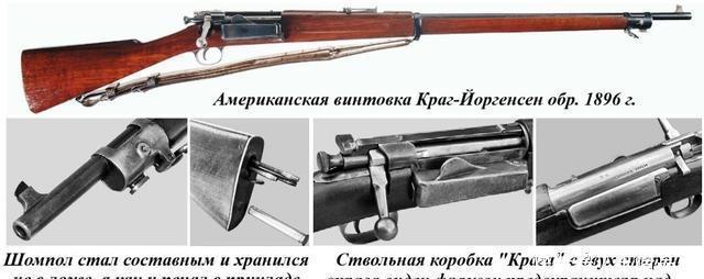 改进型号 随后对步枪进行了若干小幅改进,形成了 1896型 与 1898型 。 在 1896型 中,通条不再位于护木内,而是分段存放在枪托内部。 同年还采用了 克拉格–约根森骑兵卡宾枪 ,其特点是: 护木缩短到接近枪管一半长度的“猎枪式”外形; 护木仅用一个固定箍与枪管连接; 完全取消通条 ,改用绳状擦枪绳; 枪托左侧装有一种“老式”的带环金属支架,用于固定背带,便于骑兵携行和在马背上运输。 骑兵卡宾枪(1896型)参数: 全长: 1,041毫米 枪管长度: 560毫米 重量: 3.45千克 初速: 580米/秒