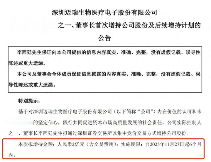 增持公告中迈瑞医疗还表示,在未来的6个月内,公司董事长李西廷将继续增持公司股份,增持金额2亿元(含本次增持金额)。